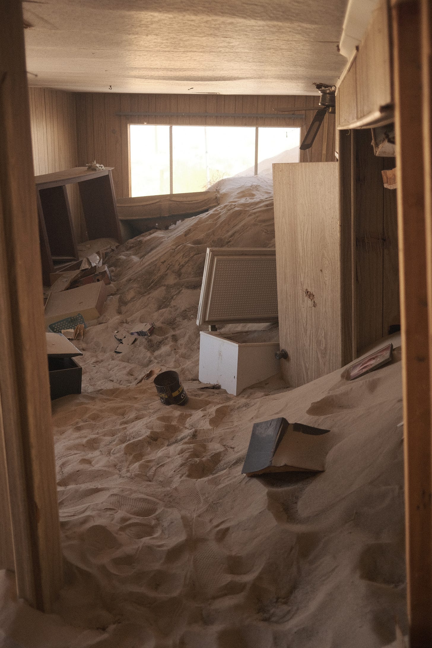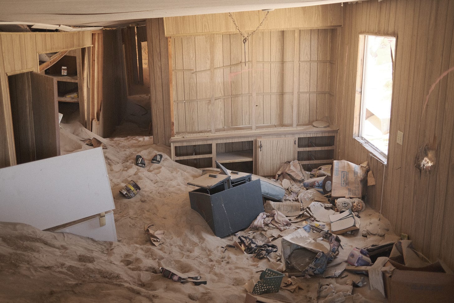The sand house photos are taken in Newberry Springs, CA — a town that was swallowed by sand over time.