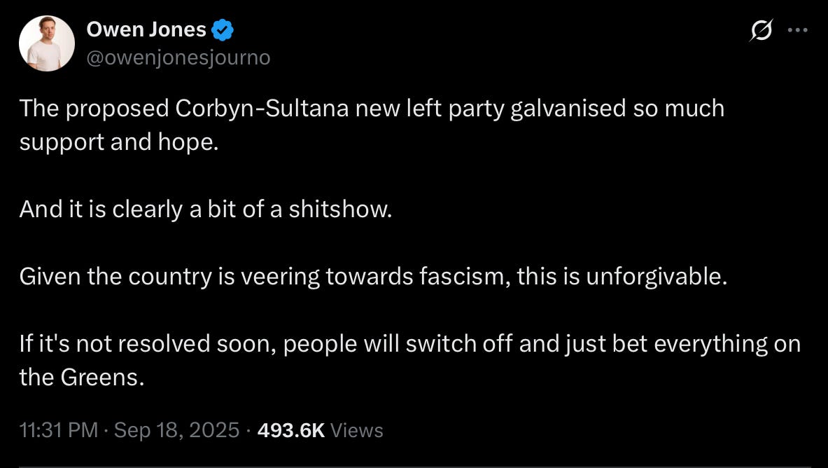 The implosion might make disillusioned Corbyn-Sultana supporters want to seek a more stable home, accelerating the Green Party’s growth. But, on the other hand, the infighting could quite simply fracture the left to the point where proportional representation could be the only remedy.