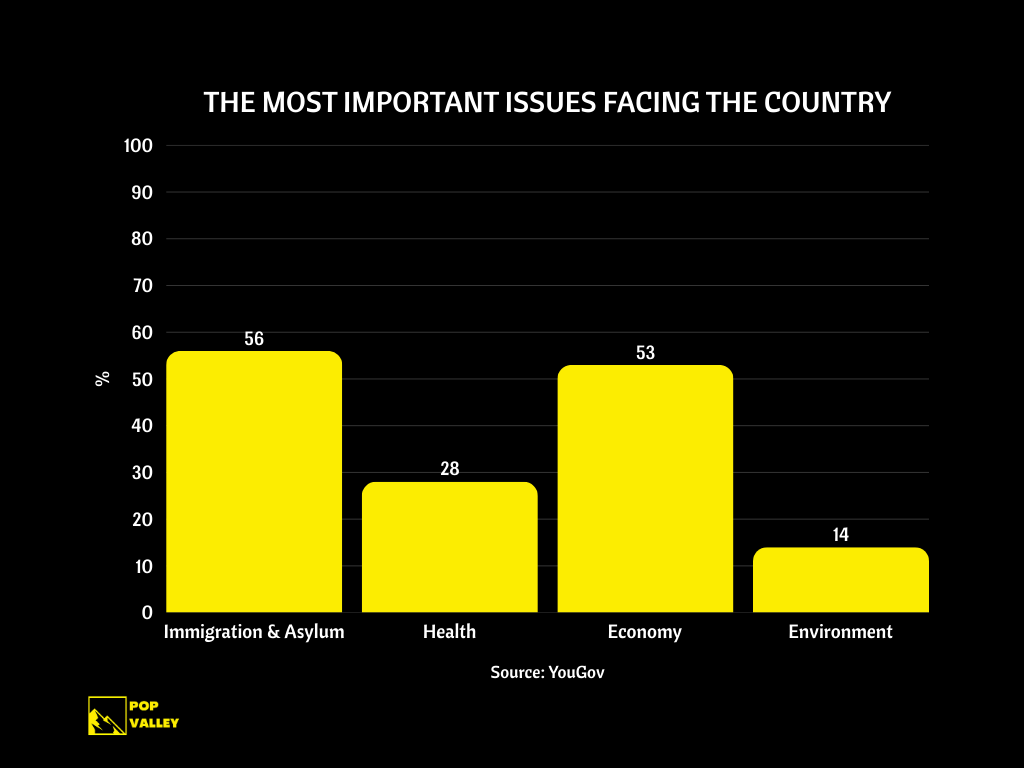 The latest YouGov polls tell us that the three most important political issues facing Britain are the economy, healthcare, and immigration.